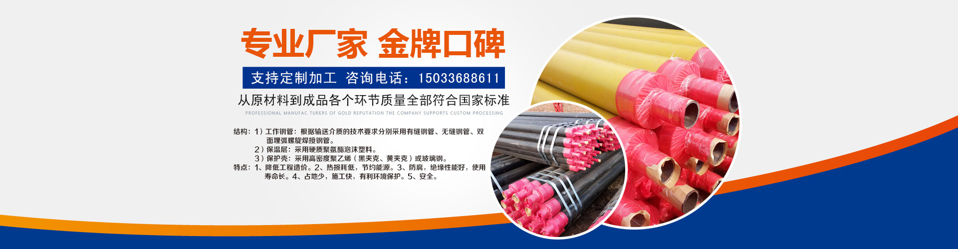 河北興松實業(yè)有限公司主營:預(yù)制直埋保溫管,鋼套鋼直埋保溫管,預(yù)制鋼套鋼保溫管,預(yù)制直埋熱水保溫管(件),預(yù)制直埋蒸汽保溫管(件),預(yù)制架空聚氨酯鍍鋅保溫管.公司自成立至今始終堅持技術(shù)領(lǐng)先、服務(wù)到位的產(chǎn)品宗旨,建立了一支由高素質(zhì)的專業(yè)技術(shù)人員和企業(yè)管理人員構(gòu)成的企業(yè)運營團(tuán)隊。我公司從國內(nèi)外引進(jìn)了大批先進(jìn)的生產(chǎn)、檢驗設(shè)備,使企業(yè)的生產(chǎn)能力、生產(chǎn)規(guī)模、技術(shù)保障與質(zhì)量控制水平始終居于國內(nèi)同行業(yè)前列。